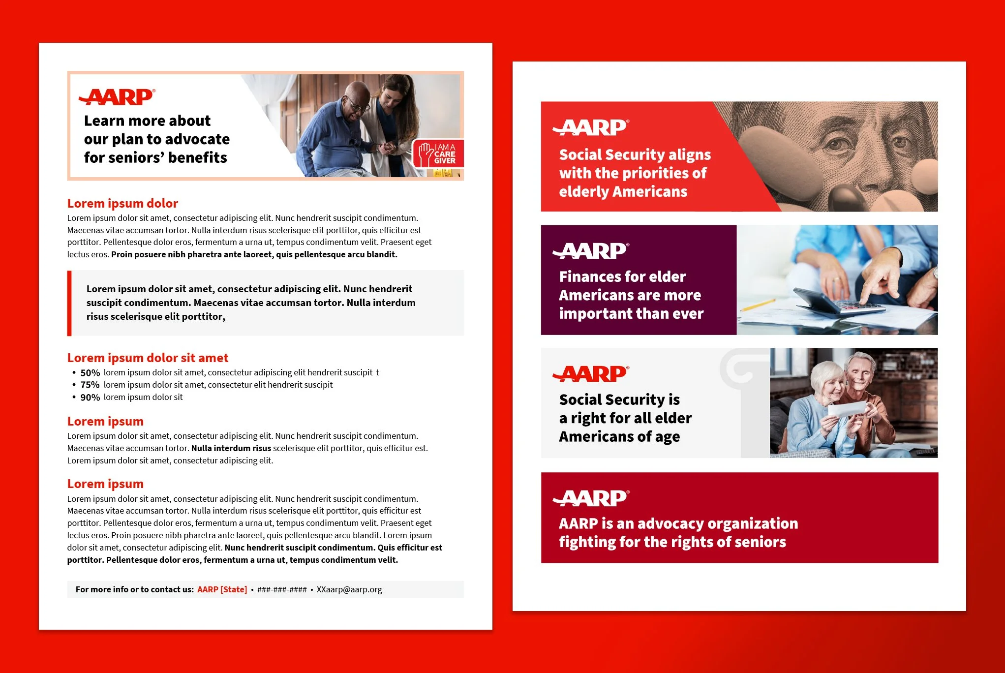 In addition to digital content, I designed multiple print documents for AARP. One key example was a piece outlining AARP’s core issue areas. For this project, I focused on creating a layout that was both visually engaging and easy to follow. I developed a system of unique yet consistent headers to give each issue area its own identity while keeping the overall design cohesive. This approach helped state chapters organize complex information in a way that felt approachable, polished, and aligned with AARP’s brand standards.