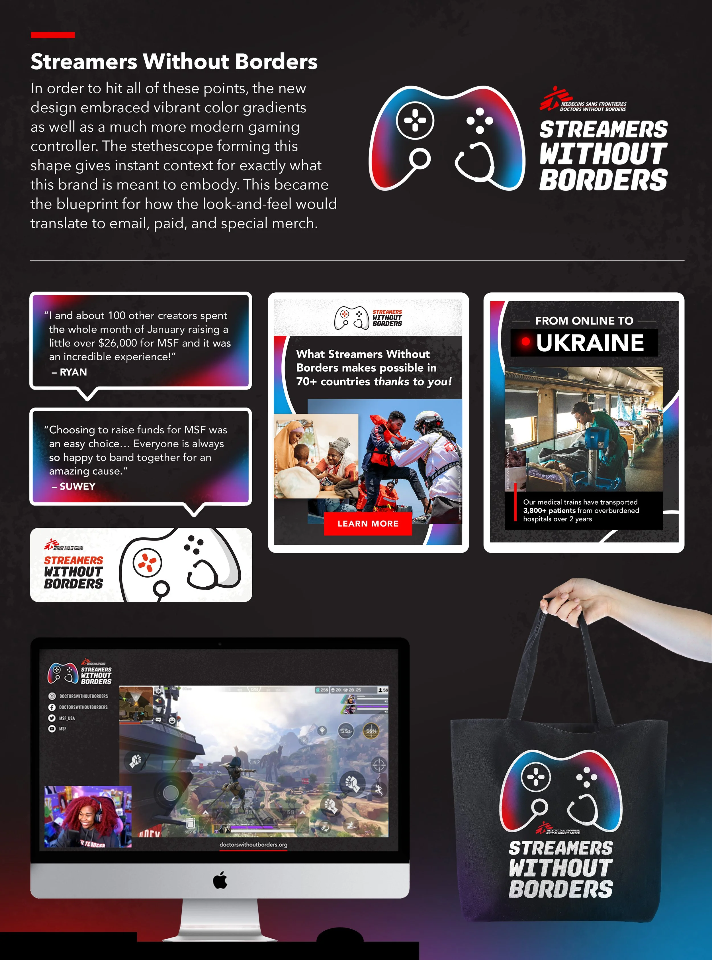 As the design lead on the Doctors Without Borders retainer account, I designed countless email graphics, print PDFs, merch items, web pages, and a myriad of other assets to contribute to their mission of providing care where it's needed most across more than 70 countries. From developing the brand for their gaming sub-brand (Streamers Without Borders) to designing on a record-breaking Giving Tuesday fundraising campaign, I am extremely proud of the work I've done for Doctors Without Borders.